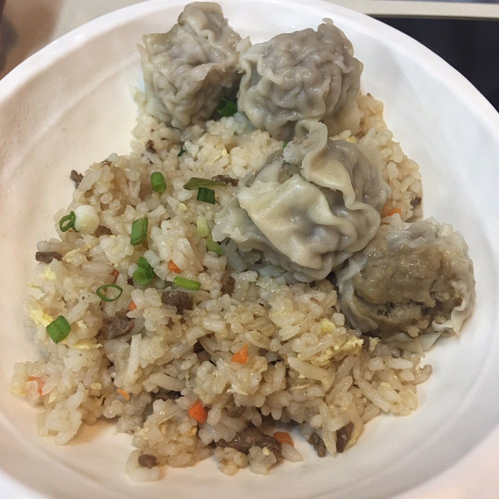 Spicy Wok-Sarap Chao Fan with meat, egg, and kangkong leaves! Served with 4pcs of Siomai.